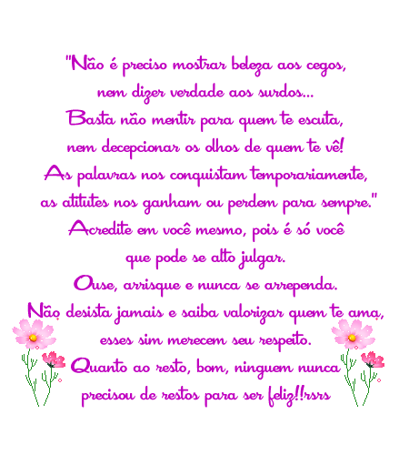 Eu sou como o vidro: se me jogar no chão eu quebro, mas se me pisar, eu corto!Sou protagonista da minha historia e nao da platéia da sua...Cansei de me importar demais e ser feliz de menos,hoje estou pensando mas em mim,por que tudo posso naquele que me fortalece...Nao vou mais chorar por aquilo que me foi inesplicavelmente tirado,vou apenas sorrir e amar aquilo que me foi dado...Obrigada senhor por me dar forças pra lutar... A cada dia uma nova prova,e uma nova conquista...
